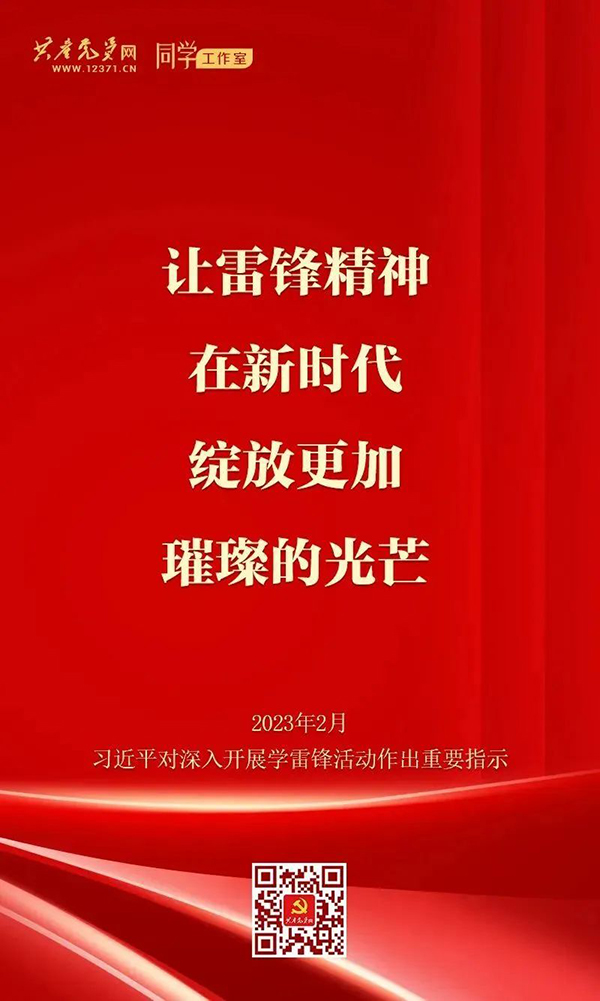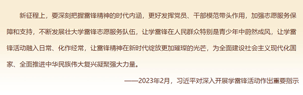 2023年2月,習(xí)近平總書(shū)記對(duì)深入開(kāi)展學(xué)雷鋒活動(dòng)作出重要指示指出,今年是毛澤東等老一輩革命家為雷鋒同志題詞60周年。60年來(lái),學(xué)雷鋒活動(dòng)在全國(guó)持續(xù)深入開(kāi)展,雷鋒的名字家喻戶曉,雷鋒的事跡深入人心,雷鋒精神滋養(yǎng)著一代代中華兒女的心靈。實(shí)踐證明,無(wú)論時(shí)代如何變遷,雷鋒精神永不過(guò)時(shí)。
