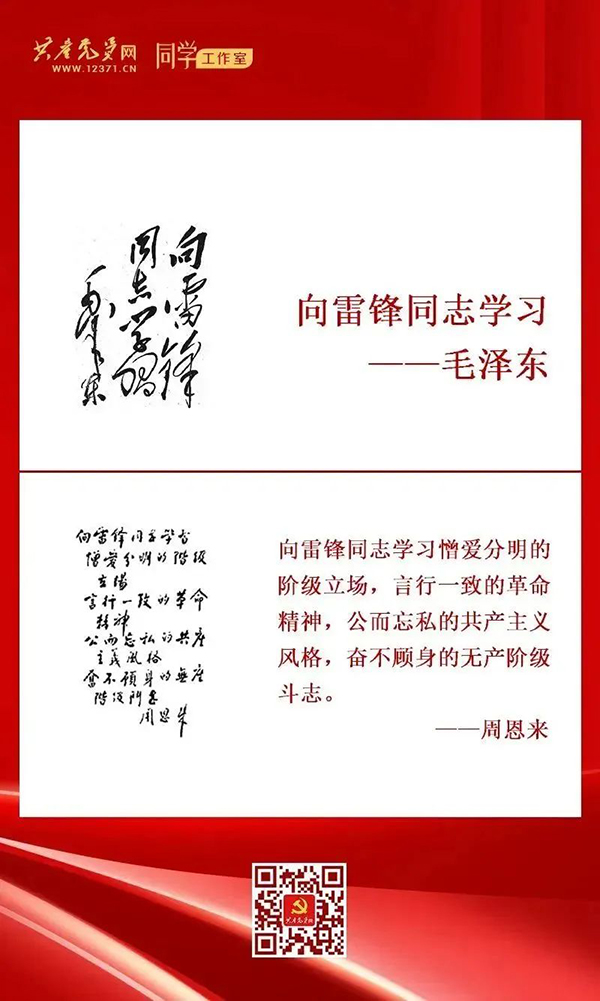1963年1月7日,國(guó)防部命名雷鋒生前所在班為“雷鋒班”。1963年3月5日,毛澤東“向雷鋒同志學(xué)習(xí)”題詞發(fā)表。隨后,劉少奇、周恩來(lái)、朱德、鄧小平等老一輩革命家也相繼題詞,發(fā)出學(xué)習(xí)雷鋒的偉大號(hào)召。