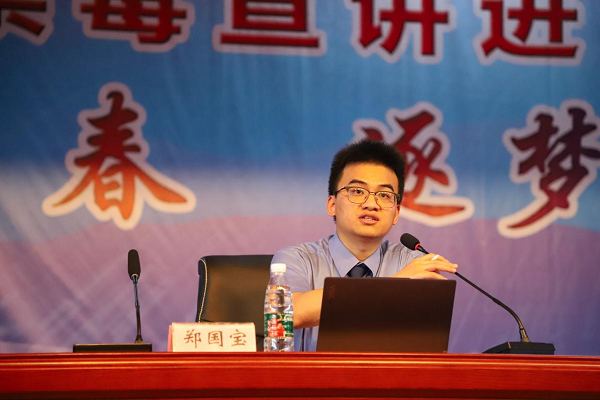 鄭國寶以“青春無毒 逐夢未來”為題,從“識毒品、知毒危、防毒誘”等方面向在場的同學們介紹了毒品的危害,現(xiàn)場講解了關于禁毒工作的方針、政策和相關法律法規(guī)。宣講中,他與同學們現(xiàn)場互動,通過觀看禁毒公益宣傳片、現(xiàn)場問答等形式從青少年學生面臨的涉毒風險,結(jié)合吸毒典型案例,為同學們講授了禁毒專業(yè)知識和防毒拒毒的方法技巧。
