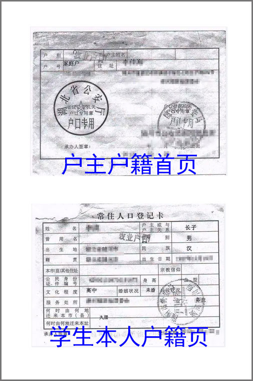 戶口本戶主戶籍面、學(xué)生本人戶籍頁復(fù)印(A4紙)
