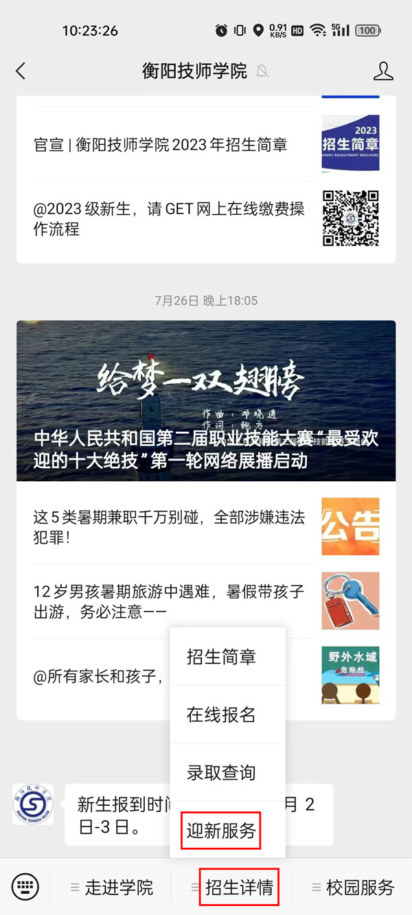2023級(jí)同學(xué)分班情況可于8月31日后通過衡陽技師學(xué)院公眾號(hào)點(diǎn)開“招生詳情--錄取查詢”菜單,輸入身份證號(hào)碼,查詢個(gè)人分班信息。