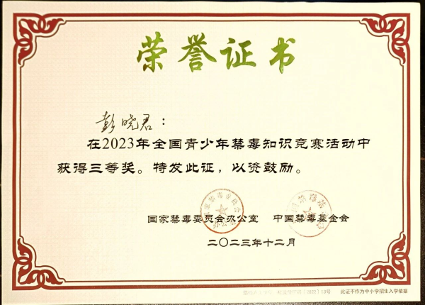 12月6日,2023年全國青少年禁毒知識競賽總決賽在福建省福州市舉行,我院20汽車營銷班學生彭曉君代表湖南隊參賽,經(jīng)過激烈角逐榮獲三等獎。