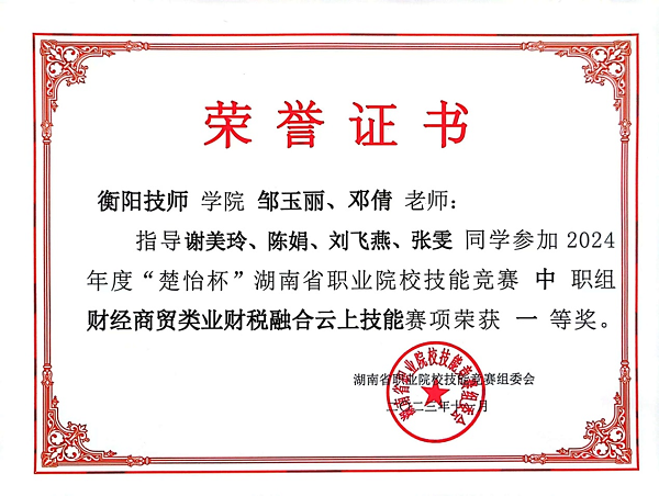 12月23日,2024年度“楚怡杯”湖南省職業(yè)院校技能競賽中職組財經(jīng)商貿(mào)類業(yè)財稅融合云上賽項落下帷幕,我院經(jīng)貿(mào)旅游學(xué)院由張雯、謝美玲、陳娟、劉飛燕組成參賽團(tuán)隊,從全省各地市州44支參賽隊的激烈比拼中脫穎而出,榮獲湖南省一等獎,指導(dǎo)教師鄒玉麗、鄧倩獲優(yōu)秀指導(dǎo)教師獎。