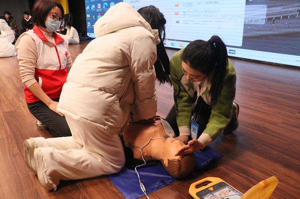 與傳統(tǒng)的培訓方式不同,此次培訓采用了理論與實踐相結合的方法。培訓開始前,學員們已在“中國紅十字會總會訓練中心”完成線上理論學習,并順利通過了線上考試。線下講解演示完畢后,同學們利用人體模型進行模擬實訓,現(xiàn)場的紅十字志愿者老師對急救姿勢及手法進行指導,并幫助同學們糾正操作中的錯誤,讓大家能夠更好地將理論知識轉化為實際操作。同學們用飽滿的熱情和認真的態(tài)度仔細學習,積極提問,主動實踐。