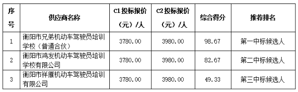 衡陽技師學(xué)院的衡陽技師學(xué)院在校學(xué)生駕駛技術(shù)培訓(xùn)校企合作項目(第二次)院內(nèi)自主招標于2024年1月26日結(jié)束,現(xiàn)將中標結(jié)果公告如下: