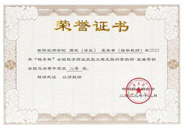 在技能競賽備賽期間,周欣常??炭嗲趭^,努力提升技能。在遇到瓶頸時,她虛心請教;在突破新方向時,及時與競賽班同學交流探討。一分耕耘一分收獲。在2023年“暢想杯”全國數(shù)字商業(yè)技能大賽互聯(lián)網(wǎng)營銷師——直播營銷全國總決賽中,最終成功獲得二等獎。