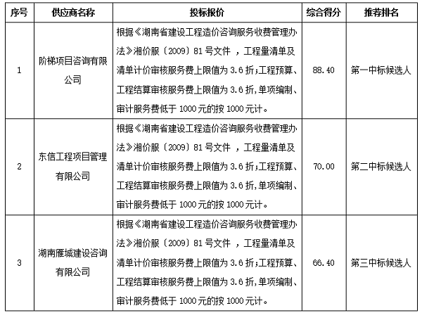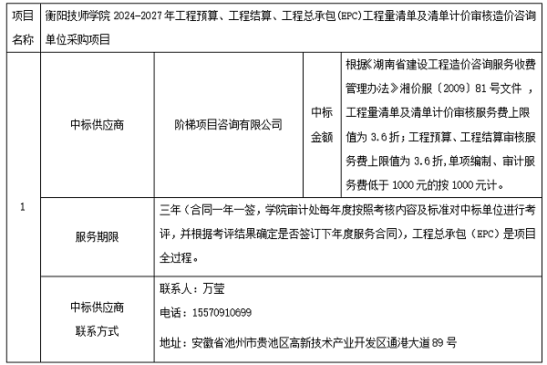 衡陽技師學院2024-2027年工程預算、工程結算、工程總承包(EPC)工程量清單及清單計價審核造價咨詢單位采購項目院內自主招標于2024年4月15日結束,現(xiàn)將中標結果公告如下: