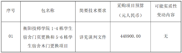 衡陽(yáng)技師學(xué)院的1-4棟學(xué)生宿舍門頁(yè)更換和5-6棟學(xué)生宿舍木門更換項(xiàng)目 進(jìn)行競(jìng)爭(zhēng)性談判采購(gòu),現(xiàn)采用發(fā)布公告方式,邀請(qǐng)符合資格條件的供應(yīng)商提交證明材料參與資格審查活動(dòng)。