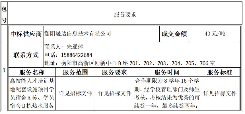 衡陽技師學院高技能人才培訓基地配套設施項目學員宿舍A棟、學員宿舍B棟熱水服務采購項目公開招標采購于2024年07月03日結束,現將中標(成交)結果公告如下: