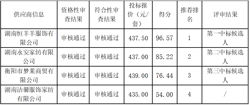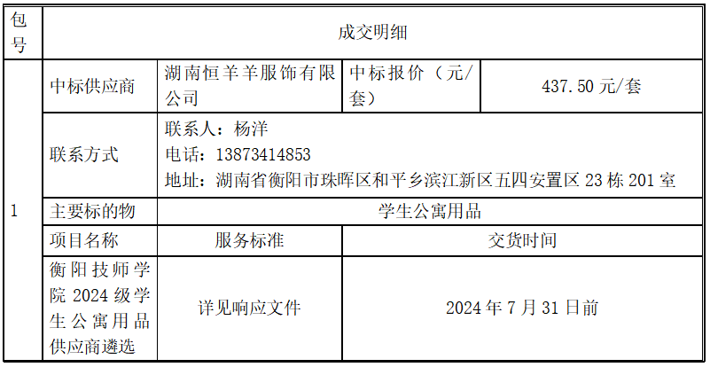 衡陽技師學(xué)院2024級學(xué)生公寓用品供應(yīng)商遴選項(xiàng)目于2024年7月3日評標(biāo)結(jié)束,現(xiàn)將中標(biāo)(成交)結(jié)果公告如下: