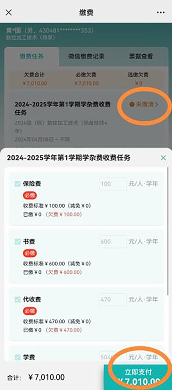 ②輸入學生姓名及身份證號碼驗證后可以繳費。