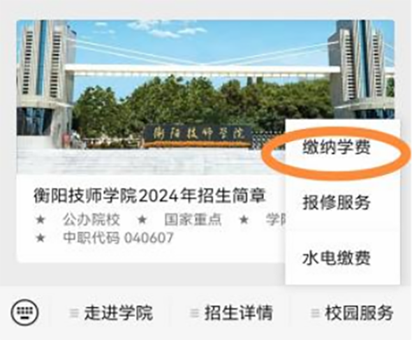 ①報名成功的學生才能繳納學費。在衡陽技師學院微信主界面底部導航欄點擊“校園服務”選擇“繳納學費”,點擊進入繳費。