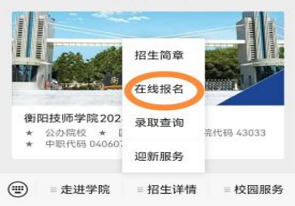 ②在衡陽技師學院微信主界面底部導航欄點擊“招生詳情”選擇“在線報名”,點擊進入報名。填寫個人資料及報讀專業(yè)等信息。