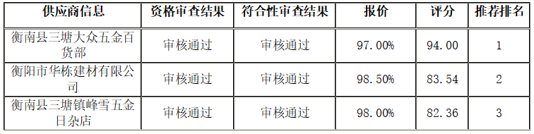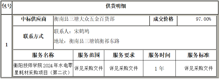 衡陽(yáng)技師學(xué)院2024年水電零星耗材采購(gòu)項(xiàng)目(第二次)公開招標(biāo)采購(gòu)項(xiàng)目于2024年07月30日結(jié)束,現(xiàn)將中標(biāo)(成交)結(jié)果公告如下:
