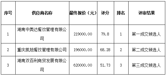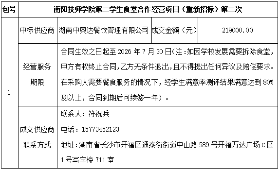 衡陽技師學(xué)院的衡陽技師學(xué)院第二學(xué)生食堂合作經(jīng)營項目(重新招標)第二次競爭性磋商采購于2023年9月30日結(jié)束,現(xiàn)將成交結(jié)果公告如下: