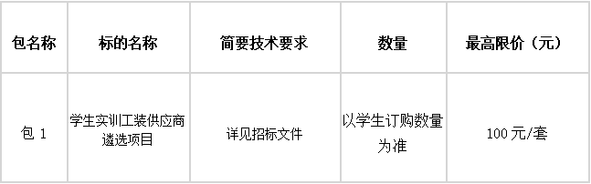 1.采購項(xiàng)目名稱:學(xué)生實(shí)訓(xùn)工裝供應(yīng)商遴選項(xiàng)目
