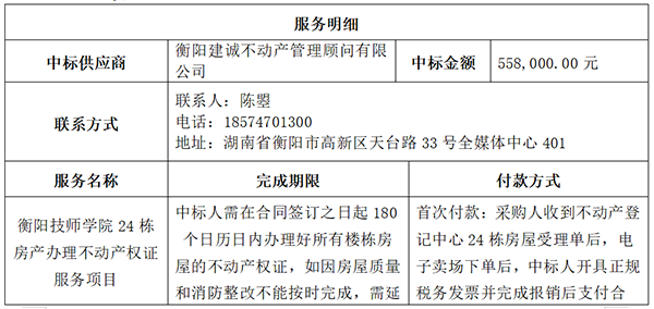衡陽技師學(xué)院24棟房產(chǎn)辦理不動(dòng)產(chǎn)權(quán)證服務(wù)項(xiàng)目于2025年01月03日結(jié)束,現(xiàn)將中標(biāo)結(jié)果公告如下: