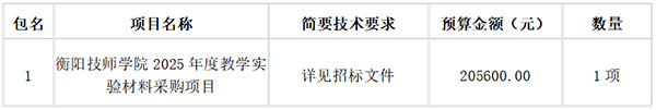 湖南省招標有限責任公司采購代理機構(gòu)受衡陽技師學院的委托,對衡陽技師學院2025年度教學實驗材料采購項目(委托代理編號:0623-2575N3624015)進行公開招標采購。歡迎符合資格條件的投標人前來投標。