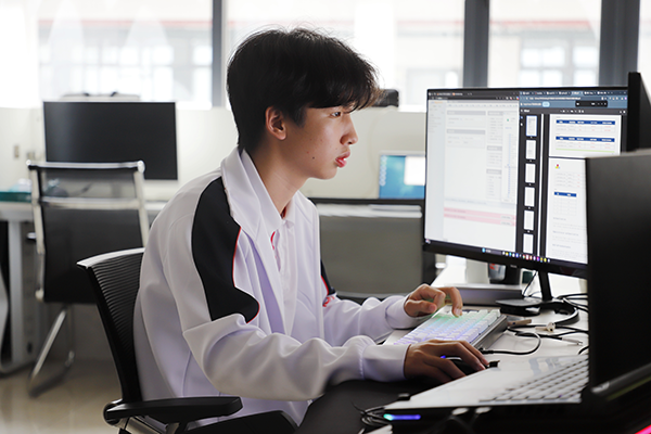 走進(jìn)公共實(shí)訓(xùn)基地903工作室,鍵盤敲打聲回蕩。從透明的玻璃門望去,陸藝茗專注地敲打著鍵盤,一行行代碼躍然跳動(dòng)于面前電腦顯示屏上。