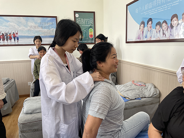 “肩頸放松按摩很舒服,身體的疲勞感也緩解了不少,感覺身體輕松了很多?!奔议L們在經(jīng)貿(mào)旅游學(xué)院針灸按摩實(shí)訓(xùn)室現(xiàn)場體驗(yàn)后開心的講道。