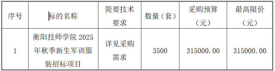 衡陽福昌招標(biāo)代理有限責(zé)任公司(采購人或采購代理機構(gòu)名稱)對衡陽技師學(xué)院2025年秋季新生軍訓(xùn)服裝招標(biāo)項目(項目名稱)進(jìn)行院內(nèi)掛網(wǎng)公開招標(biāo),現(xiàn)將采購事項公告如下: