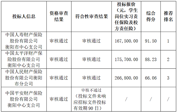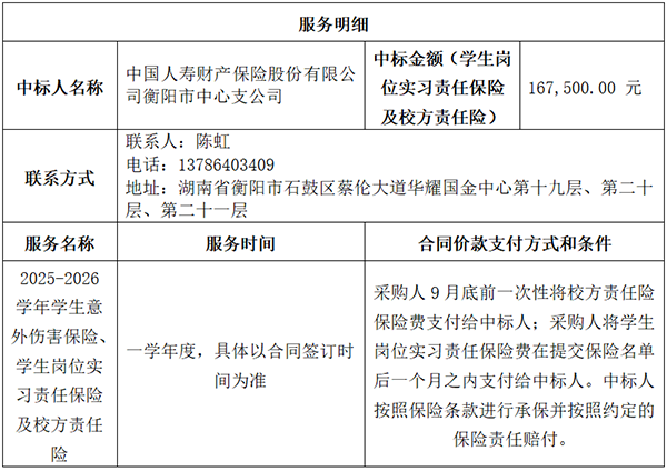 衡陽技師學院2025-2026學年學生意外傷害保險、學生崗位實習責任保險及校方責任險項目于2025年6月16日結束,現(xiàn)將中標結果公告如下: