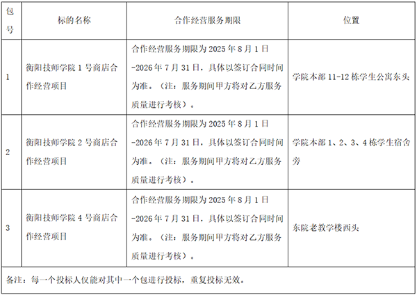 衡陽技師學(xué)院的衡陽技師學(xué)院1、2、4號商店合作經(jīng)營項(xiàng)目院內(nèi)招標(biāo)于2025年6月18日結(jié)束,現(xiàn)將中標(biāo)結(jié)果公告如下: