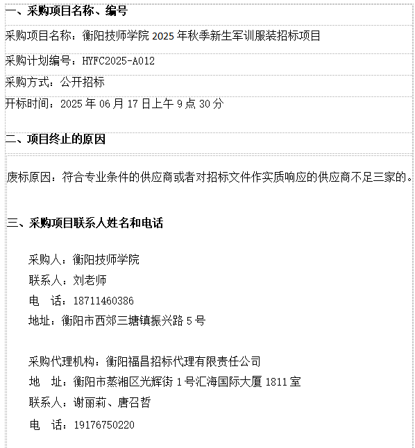 衡陽(yáng)技師學(xué)院2025年秋季新生軍訓(xùn)服裝招標(biāo)項(xiàng)目 廢標(biāo)公告