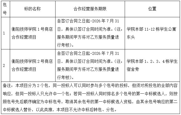 華新項目管理集團(tuán)有限公司受衡陽技師學(xué)院的委托,對衡陽技師學(xué)院1、2號商店合作經(jīng)營項目進(jìn)行院內(nèi)自主招標(biāo),邀請符合資質(zhì)條件的投標(biāo)人來參加投標(biāo)。