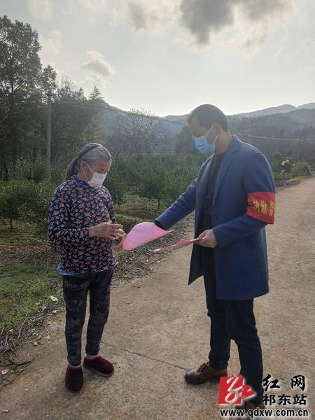 圖為衡陽(yáng)技師學(xué)院駐靈官鎮(zhèn)興龍村駐村工作隊(duì)隊(duì)員唐濤向村民發(fā)放防控疫情宣傳資料