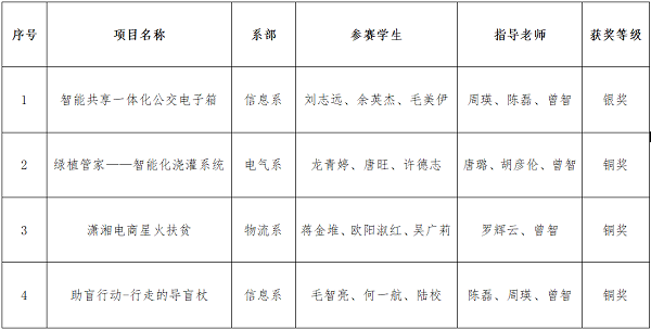 經(jīng)校賽遴選、資格審查、專家盲審等環(huán)節(jié)后,全省共498件作品入圍決賽。我院的《智能共享一體化公交電子箱》項目奪得銀獎,《綠植管家——智能化澆灌系統(tǒng)》《瀟湘電商星火扶貧》《助盲行動-行走的導盲杖》3個項目榮獲銅獎。