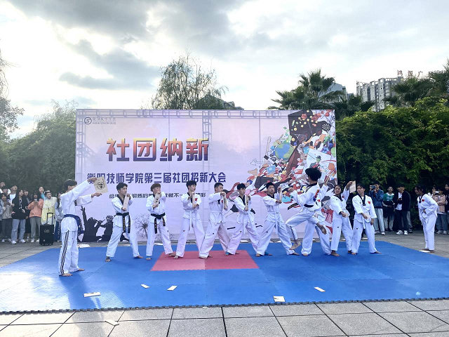 招新大會(huì)人聲鼎沸,熱鬧非凡。社團(tuán)精心布置招新點(diǎn),紛紛拿出看家本領(lǐng),通過擺放展板、特色活動(dòng)展演和發(fā)放宣傳單張等形式來展示社團(tuán)特色,吸引新同學(xué)。首先,團(tuán)委書記肖振衡為2019-2020學(xué)年優(yōu)秀學(xué)生社團(tuán)頒發(fā)了獎(jiǎng)牌和獎(jiǎng)金。隨后各社團(tuán)開展了豐富多彩的展演活動(dòng),匠心志愿者協(xié)會(huì)的志愿者們將自己參加志愿服務(wù)的經(jīng)歷與感受分享給同學(xué)們;漢文化社團(tuán)的社員身著華麗服飾,給同學(xué)們展示和宣傳漢服文化;跆拳道社團(tuán)通過套路和技法表演,倡導(dǎo)了“禮義廉恥,忍耐克己,百折不屈”的跆拳道精神;滑板和輪滑社團(tuán)通過技巧表演展現(xiàn)了滑板、輪滑運(yùn)動(dòng)的靈動(dòng);動(dòng)漫社團(tuán)通過角色扮演,生動(dòng)展示各種動(dòng)漫人物的形象;吉他協(xié)會(huì)、說唱協(xié)會(huì)、聲樂團(tuán)也紛紛表演了不同風(fēng)格的歌曲演唱,整個(gè)展演環(huán)節(jié)形式多樣,有聲有色。