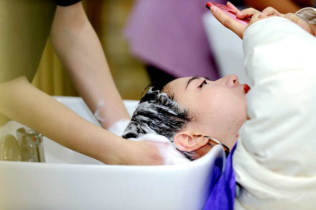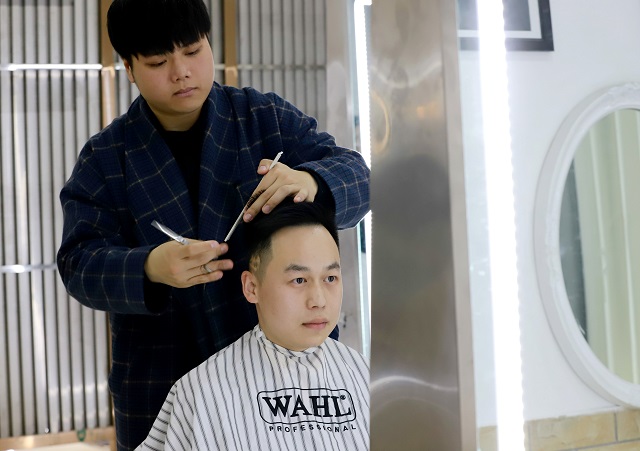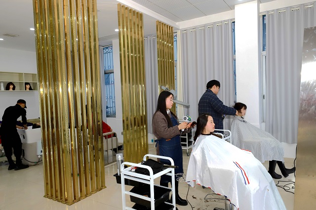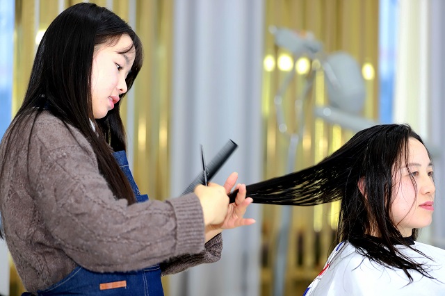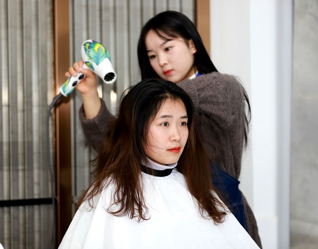 李雯和他的小伙伴們熱情迎接著受邀的每一位老師就座,拿上工具,使出所學(xué),為老師們精心清洗修剪吹燙。三個小時的體驗(yàn)時間,老師們看著鏡子中的自己?!皬膩頉]想過自己在學(xué)校就能親身體驗(yàn)學(xué)生們的服務(wù),感受到孩子們的愛,一切的付出都是值得的?!卑嘀魅卫钣駥ν瑢W(xué)們的手藝非常滿意。