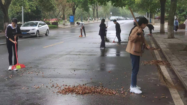 19計(jì)輔班志愿者發(fā)揚(yáng)不怕苦、不怕臟、不怕累的精神,清理校園衛(wèi)生,扮靚校園環(huán)境。