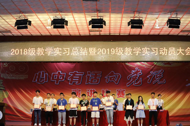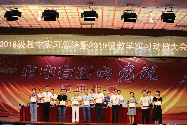 會上,表彰了在本次教學(xué)實習(xí)中表現(xiàn)優(yōu)異的10位優(yōu)秀指導(dǎo)老師和80位優(yōu)秀實習(xí)生。2018級優(yōu)秀帶隊老師、優(yōu)秀學(xué)生代表分別分享了自已在教學(xué)實習(xí)中的經(jīng)歷感悟、心得體會以及實習(xí)經(jīng)驗,2019級班主任代表和學(xué)生代表做了表態(tài)發(fā)言。