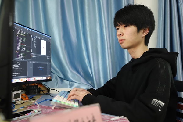 郭浩嵐是2018級(jí)計(jì)算機(jī)程序設(shè)計(jì)專業(yè)五年制高技學(xué)生。因?yàn)閺男〉酱笠恢痹诮佑|電腦,所以他選擇了與計(jì)算機(jī)相關(guān)的專業(yè),學(xué)習(xí)計(jì)算機(jī)軟件設(shè)計(jì)。