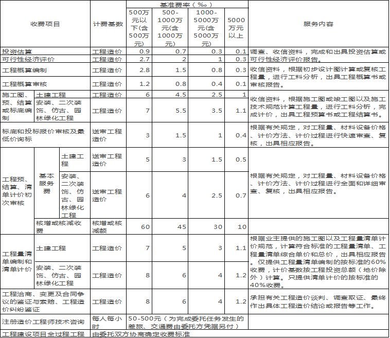 注:1、上表收費(fèi)實(shí)行差額定率累進(jìn)計(jì)費(fèi),低于1000元的按1000元。計(jì)費(fèi)方式舉例如下:某土建工程施工圖預(yù)算編制的工程造價(jià)為5000萬(wàn),計(jì)算服務(wù)費(fèi)為:500萬(wàn)元*6‰+(1000-500)萬(wàn)元*4.5‰+(5000-1000)萬(wàn)元*2.5‰=15.25萬(wàn)元;