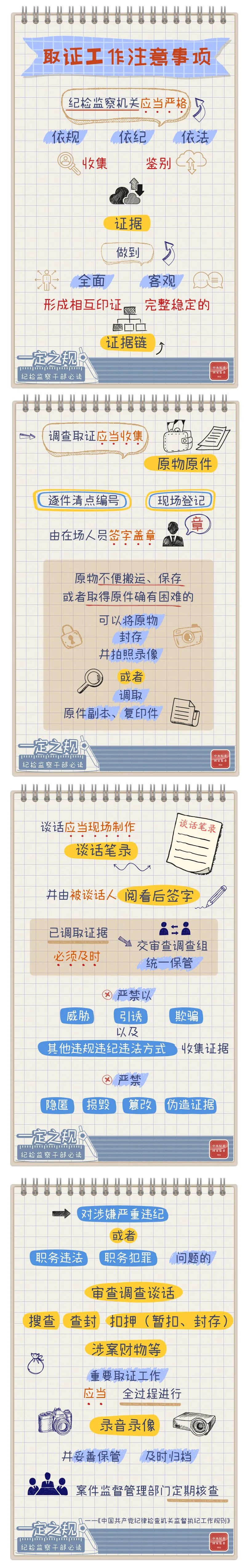 調(diào)查取證應(yīng)當(dāng)收集原物原件,逐件清點編號,現(xiàn)場登記,由在場人員簽字蓋章,原物不便搬運(yùn)、保存或者取得原件確有困難的,可以將原物封存并拍照錄像或者調(diào)取原件副本、復(fù)印件;談話應(yīng)當(dāng)現(xiàn)場制作談話筆錄并由被談話人閱看后簽字。已調(diào)取證據(jù)必須及時交審查調(diào)查組統(tǒng)一保管。