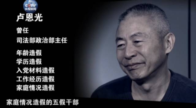 【解說(shuō)詞】調(diào)查發(fā)現(xiàn),盧恩光是一名年齡造假、學(xué)歷造假、入黨材料造假、工作經(jīng)歷造假、家庭情況造假的“五假干部”。這是改革開(kāi)放以來(lái)一起罕見(jiàn)的個(gè)人情況全面造假,金錢(qián)開(kāi)道、投機(jī)鉆營(yíng)、跑官買(mǎi)官,從一名私營(yíng)企業(yè)主一步步變身為副部級(jí)領(lǐng)導(dǎo)干部的典型案件。盧恩光的嚴(yán)重違紀(jì)問(wèn)題得以浮出水面,源于中央巡視組巡視司法部時(shí),核查他入黨材料時(shí)的一個(gè)發(fā)現(xiàn)。