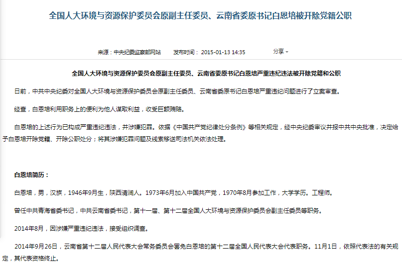 白恩培(全國(guó)人大環(huán)資委原副主任):我自己腐敗了,但是我非常期盼中央能夠加大反腐敗的力度。十八大以后中央采取從嚴(yán)治黨的一系列措施,嚴(yán)肅查處腐敗,這就是黨的希望,只有這樣子我們黨才能夠承擔(dān)起歷史責(zé)任。
