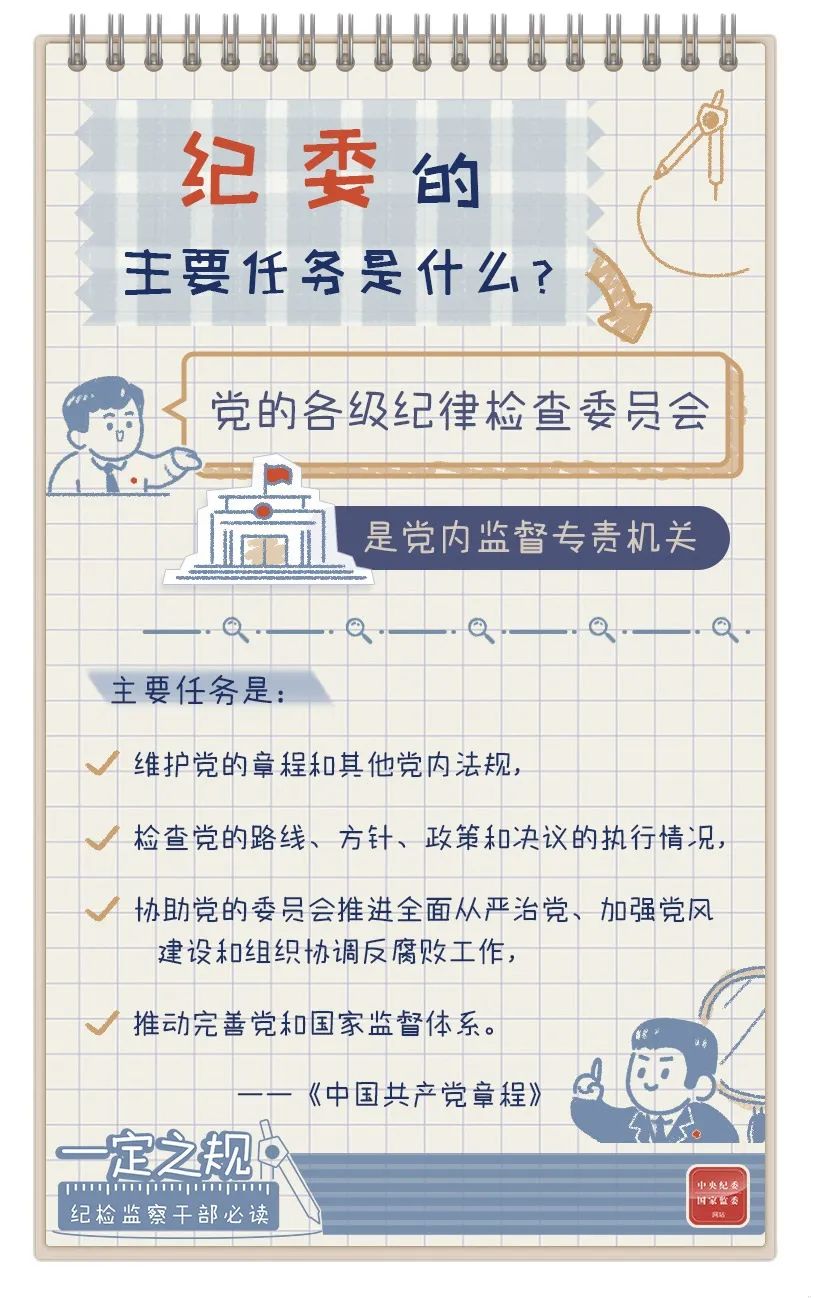 第四十六條 黨的各級(jí)紀(jì)律檢查委員會(huì)是黨內(nèi)監(jiān)督專責(zé)機(jī)關(guān),主要任務(wù)是:維護(hù)黨的章程和其他黨內(nèi)法規(guī),檢查黨的路線、方針、政策和決議的執(zhí)行情況,協(xié)助黨的委員會(huì)推進(jìn)全面從嚴(yán)治黨、加強(qiáng)黨風(fēng)建設(shè)和組織協(xié)調(diào)反腐敗工作,推動(dòng)完善黨和國(guó)家監(jiān)督體系。