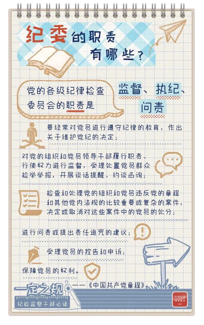 黨的各級(jí)紀(jì)律檢查委員會(huì)的職責(zé)是監(jiān)督、執(zhí)紀(jì)、問(wèn)責(zé),要經(jīng)常對(duì)黨員進(jìn)行遵守紀(jì)律的教育,作出關(guān)于維護(hù)黨紀(jì)的決定;對(duì)黨的組織和黨員領(lǐng)導(dǎo)干部履行職責(zé)、行使權(quán)力進(jìn)行監(jiān)督,受理處置黨員群眾檢舉舉報(bào),開展談話提醒、約談函詢;檢查和處理黨的組織和黨員違反黨的章程和其他黨內(nèi)法規(guī)的比較重要或復(fù)雜的案件,決定或取消對(duì)這些案件中的黨員的處分;進(jìn)行問(wèn)責(zé)或提出責(zé)任追究的建議;受理黨員的控告和申訴;保障黨員的權(quán)利。