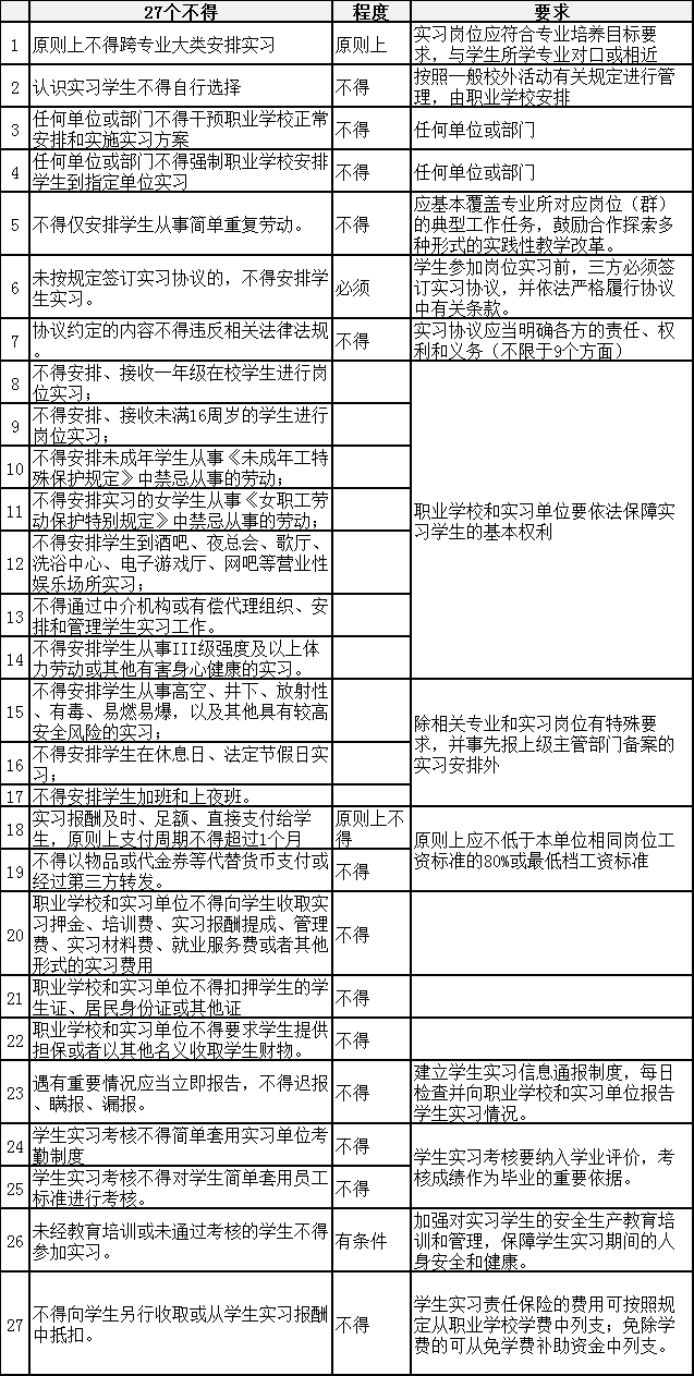 職業(yè)學(xué)校學(xué)生實(shí)習(xí)管理規(guī)定的“27個(gè)不得”一覽表