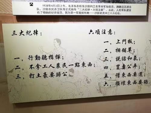 4月3日上午,在沙田圩老虎沖,毛澤東總結了建軍以來的經(jīng)驗和教訓,對部隊近期存在的一些違反紀律的現(xiàn)象進行了批評教育,正式頒布“三大紀律·六項注意”,并確定為工農(nóng)革命軍的軍規(guī)。三大紀律是:一、行動聽指揮;二、不拿工人農(nóng)民一點東西;三、打土豪要歸公;六項注意是:一、上門板;二、捆鋪草;三、說話和氣;四、買賣公平;五、借東西要還;六、損壞東西要賠。