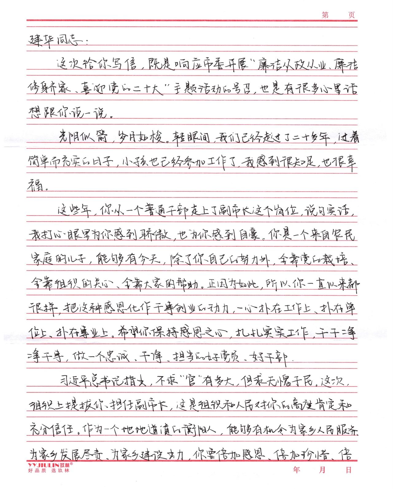 這次給你寫(xiě)信,既是響應(yīng)市委開(kāi)展“廉潔從政從業(yè)、廉潔修身齊家、喜迎黨的二十大”主題活動(dòng)的號(hào)召,也是有很多心里話想跟你說(shuō)一說(shuō)。