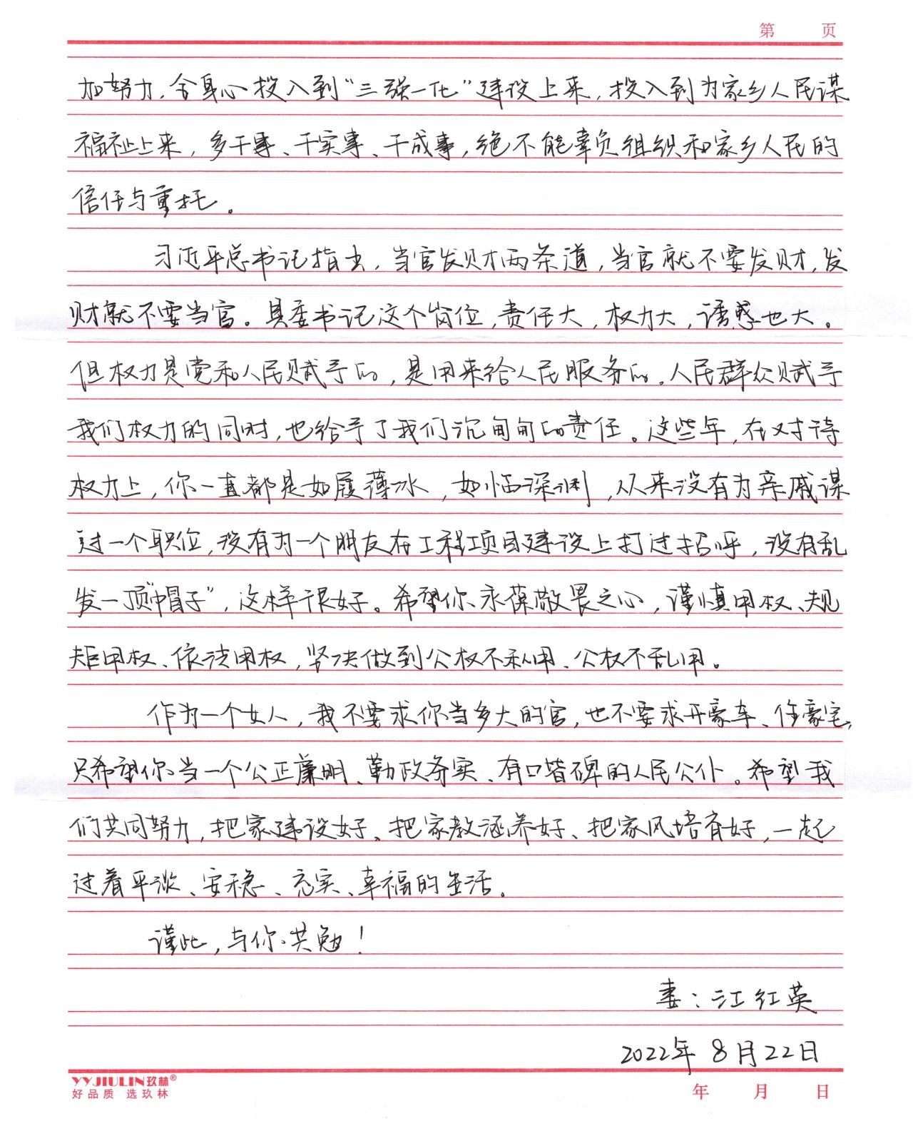最后,我想在你廉潔從政的路上,再啰唆幾句:廉潔就如同出淤泥而不染的清蓮。面對(duì)誘惑,多想家人,不忘初心、牢記使命;我真正想要的,不是錦衣華服,不是高廣美宅,而是珍惜眼前的一切,這樣日子才會(huì)細(xì)水長(zhǎng)流,只希望你一直是兒子心中不變的榜樣——擔(dān)當(dāng)、正直、睿智。同時(shí),我也會(huì)做好自己,努力做一位好妻子、好母親,做到知廉、倡廉、守廉、護(hù)廉,爭(zhēng)做一名“勤內(nèi)助”“賢內(nèi)助”“廉內(nèi)助”,讓我們的家庭更加幸福和睦。
