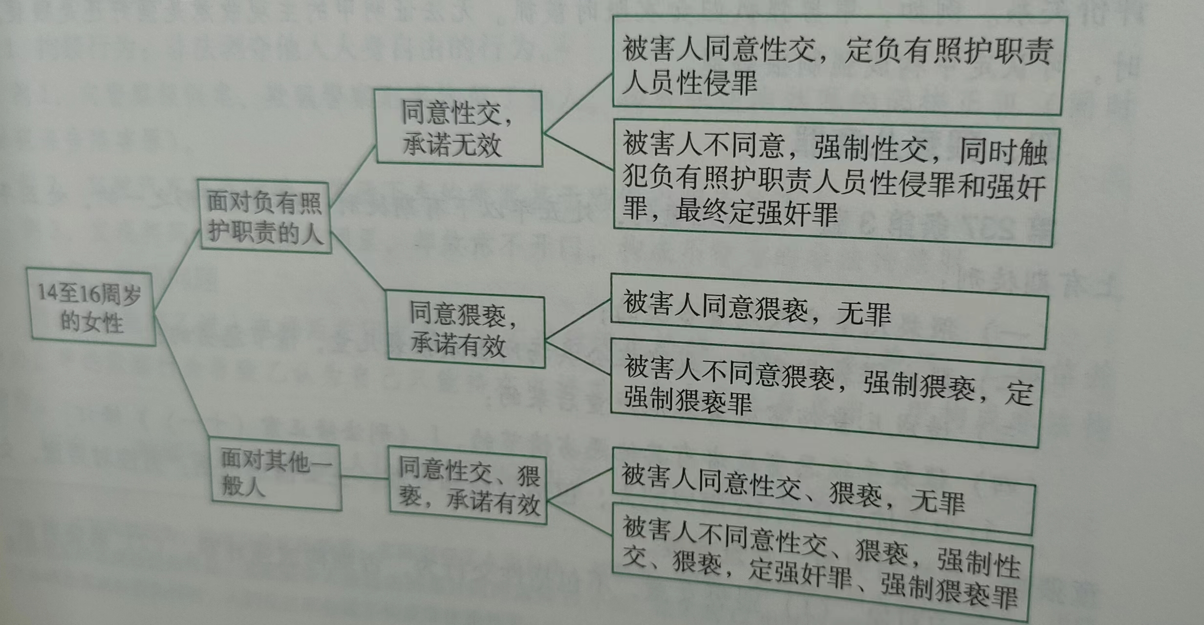 從立法本意不難看出,在負(fù)有照護(hù)職責(zé)的人員與未成年人之間,基于前者的特殊職責(zé)及雙方年齡、地位、身份等的不對(duì)等關(guān)系,二者之間易形成一種隱性強(qiáng)制狀態(tài)。負(fù)有照護(hù)職責(zé)的人員對(duì)其照護(hù)的未成年女性即使不使用明顯的強(qiáng)制手段,也足以達(dá)到壓制對(duì)方表達(dá)真實(shí)意志的強(qiáng)制效果;如果行為人利用特殊職責(zé)所形成的隱性強(qiáng)制狀態(tài),與其照護(hù)的已滿十四周歲不滿十六周歲的未成年女性發(fā)生性關(guān)系,即使未使用暴力、脅迫或者其他強(qiáng)制手段,其行為仍屬于違背婦女意志,依法應(yīng)構(gòu)成負(fù)有照護(hù)職責(zé)人員性侵罪。