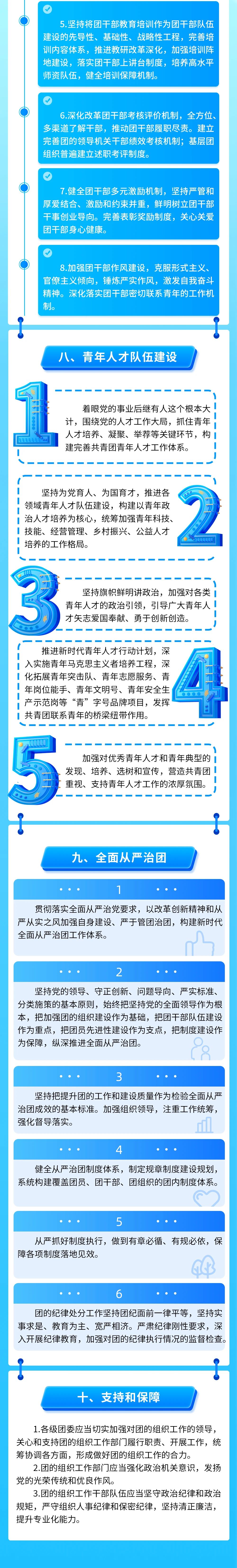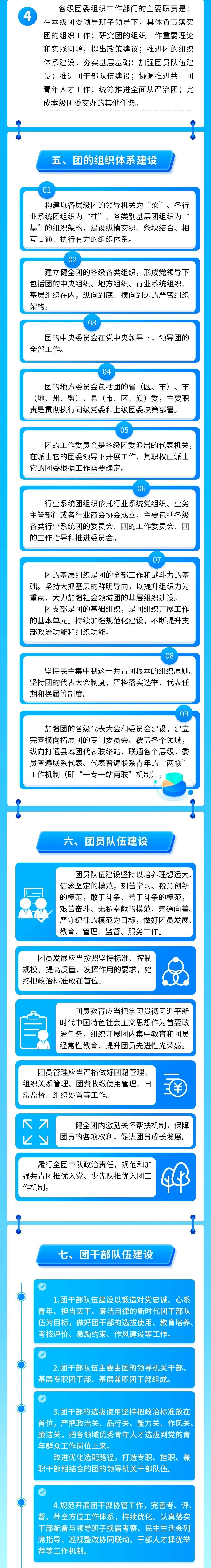 《條例》共分為九個(gè)章節(jié),從領(lǐng)導(dǎo)和職責(zé)、團(tuán)的組織體系建設(shè)、團(tuán)員隊(duì)伍建設(shè)、團(tuán)干部隊(duì)伍建設(shè)、青年人才隊(duì)伍建設(shè)、全面從嚴(yán)治團(tuán)、支持和保障等方面作出規(guī)定。