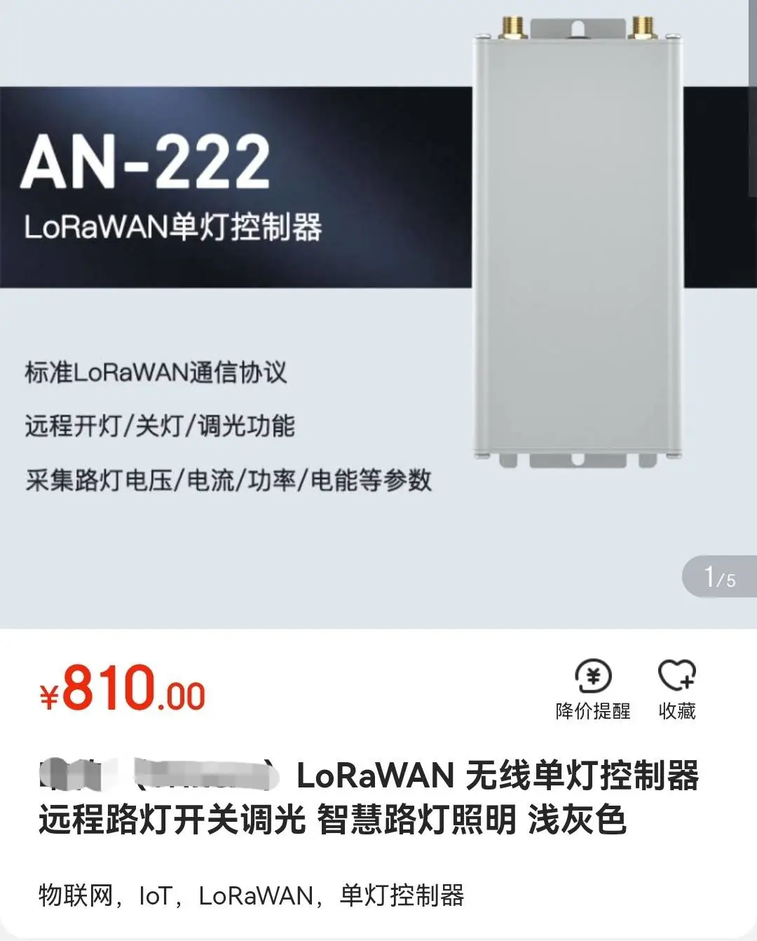 廠商官網(wǎng)顯示,AN222單燈控制器是一款路燈節(jié)能產(chǎn)品,可以對單盞路燈的電壓、電流、功率、電能等工作參數(shù)進(jìn)行監(jiān)控與采集,同時(shí)具有控制路燈開關(guān)和調(diào)光等功能。該公司電商平臺(tái)的旗艦店中,同型號(hào)產(chǎn)品售價(jià)為810元。