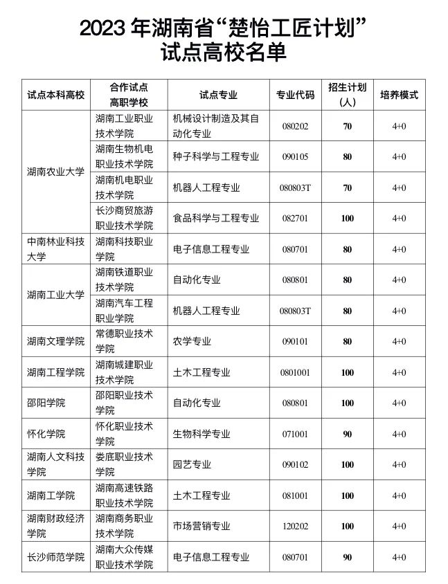 《通知》明確,“楚怡工匠計(jì)劃”招生對象為符合我省普通高校招生考試(含普通高考和對口招生考試)報(bào)名條件,并已參加我省普通高校招生考試報(bào)名的考生。試點(diǎn)學(xué)校為省屬有關(guān)普通本科高校與高水平高職院校,試點(diǎn)專業(yè)主要聚焦服務(wù)“三高四新”、鄉(xiāng)村振興戰(zhàn)略的專業(yè)。培養(yǎng)模式將采取“4+0”模式(4年均在高職院校培養(yǎng))或“2+2”模式(本科高校和高職院校各培養(yǎng)2年),畢業(yè)后頒發(fā)本科院校畢業(yè)文憑。2023年,省教育廳遴選湖南農(nóng)業(yè)大學(xué)等11所本科高校、湖南工業(yè)職業(yè)技術(shù)學(xué)院等15所高職院校進(jìn)行試點(diǎn),試點(diǎn)總規(guī)模為1320人。